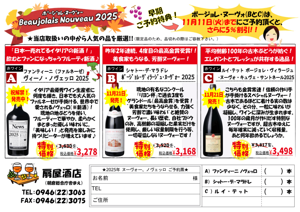ボージョレ・ヌーヴォーは、早期ご予約で更に5%オフ!(~11月11日まで)。