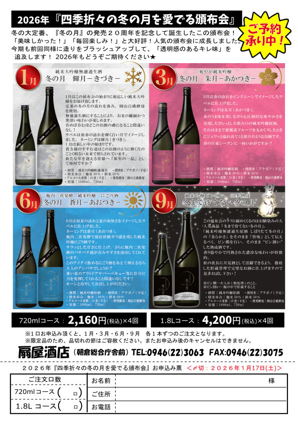 1.人気のお酒「冬の月」が季節ごとの味わいの頒布会に!